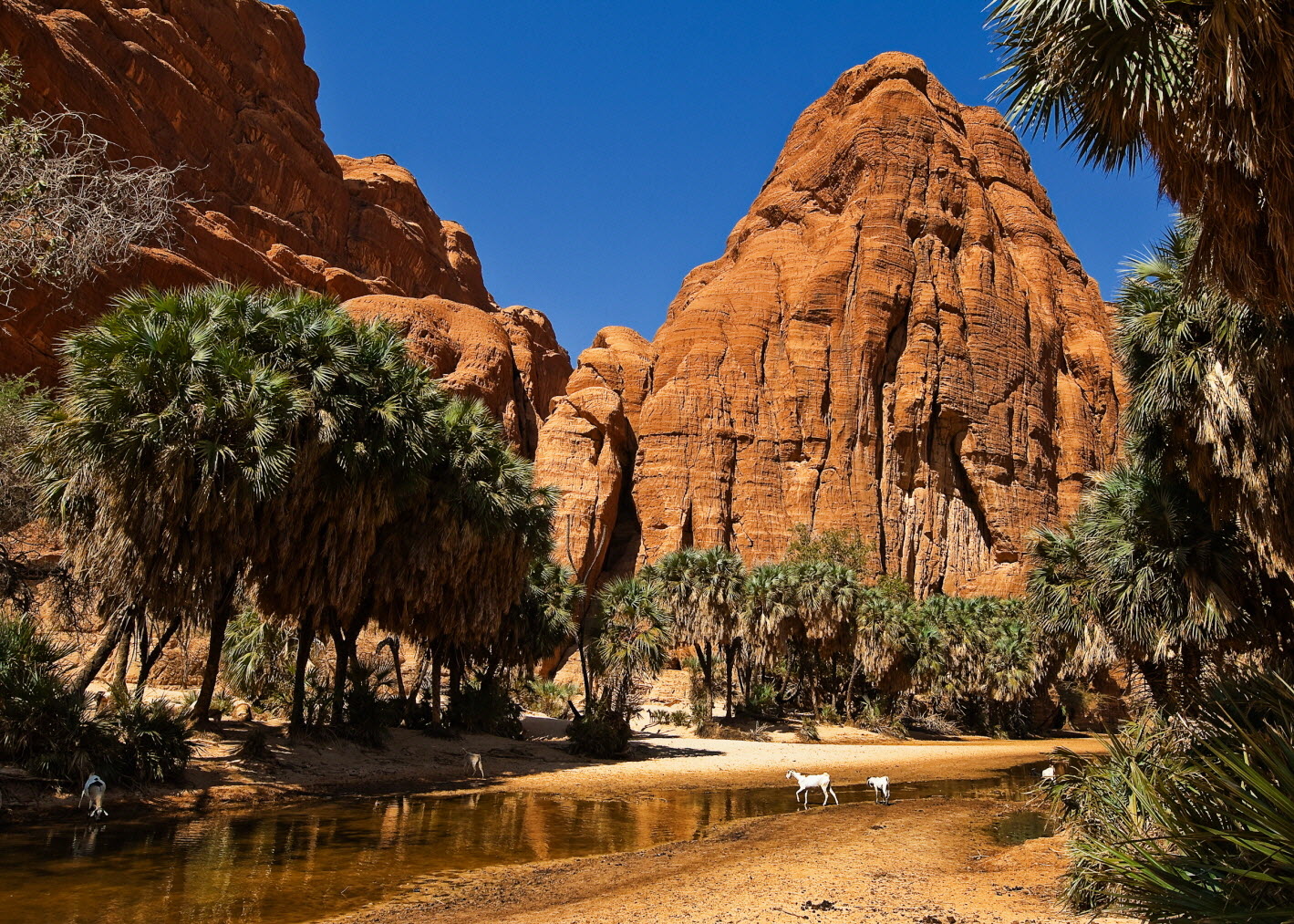 Les oasis du Tibesti, situées dans une région désertique du nord du Tchad, sont des sources rares d'eau douce essentielles à la vie. Elles permettent d'irriguer les terres agricoles, d'abreuver le bétail et de soutenir la biodiversité locale. Historiquement et culturellement, elles sont des lieux de rencontre et de traditions pour les populations locales.